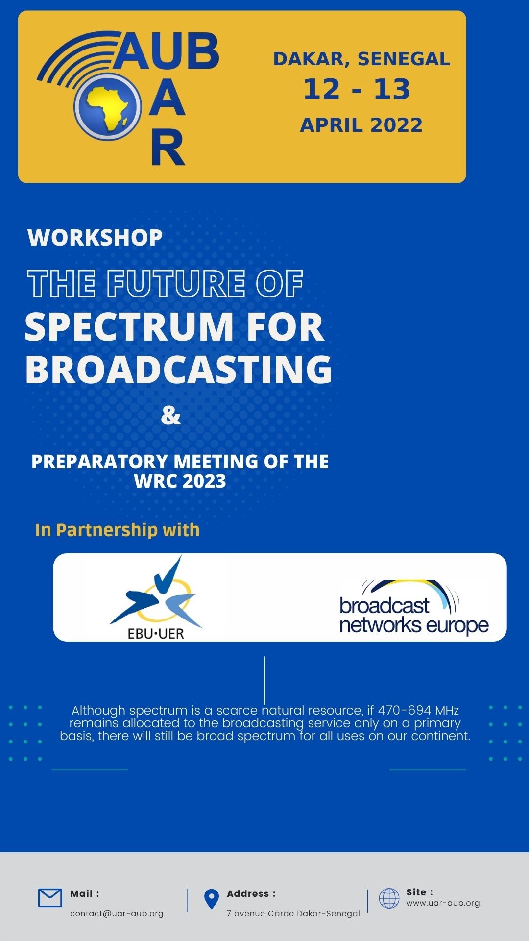 The African Union of Broadcasting (AUB) (www.uar-AUB.org) is pleased to inform the national and international opinion that it will organize in partnership with the European Broadcasting Union (EBU) and Broadcast Network Europe (BNE) a public workshop with stakeholders on “The future of the Spectrum for Broadcasting”.